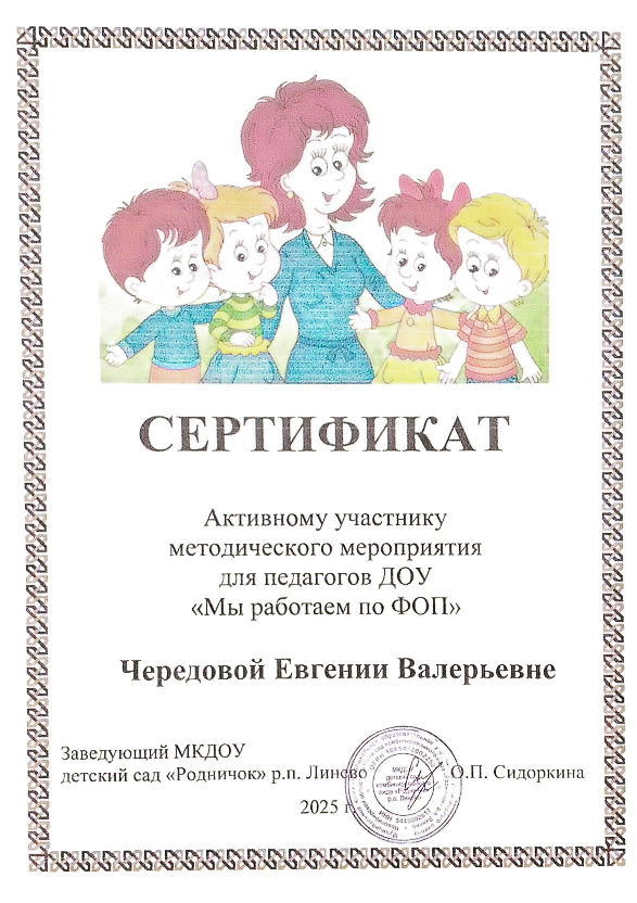 Сертификат активного участника методического мероприятия для педагогов ДОУ "Мы работаем по ФОП"