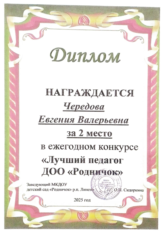 Диплом за 1 место "Лучший педагог ДОО "Родничок"