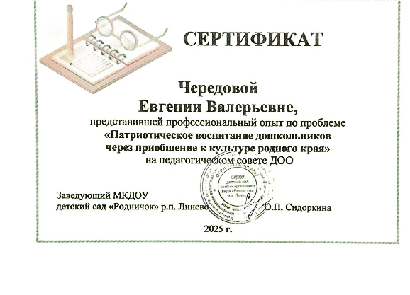 Сертификат предоставления профессионального опыта по проблеме "Патриотическое воспитание дошкольников через приобщение к культуре родного края"