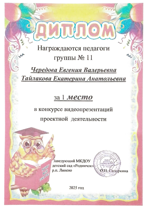 Диплом конкурс видео презентаций 1 место,2023 год