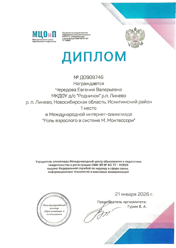 Диплом,1 место в международной интернет - олимпиаде "Роль взрослого в системе М.Монтессори", 21.01.2026