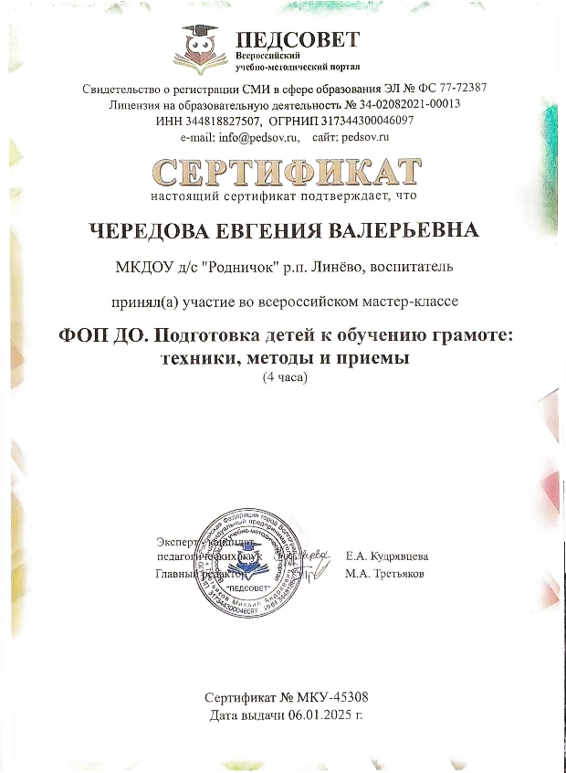 Сертификат за участие во всероссийском мастер-классе "ФОП ДО. Подготовка детей к обучению грамоте: техники, методы и приемы" 06.01.2025