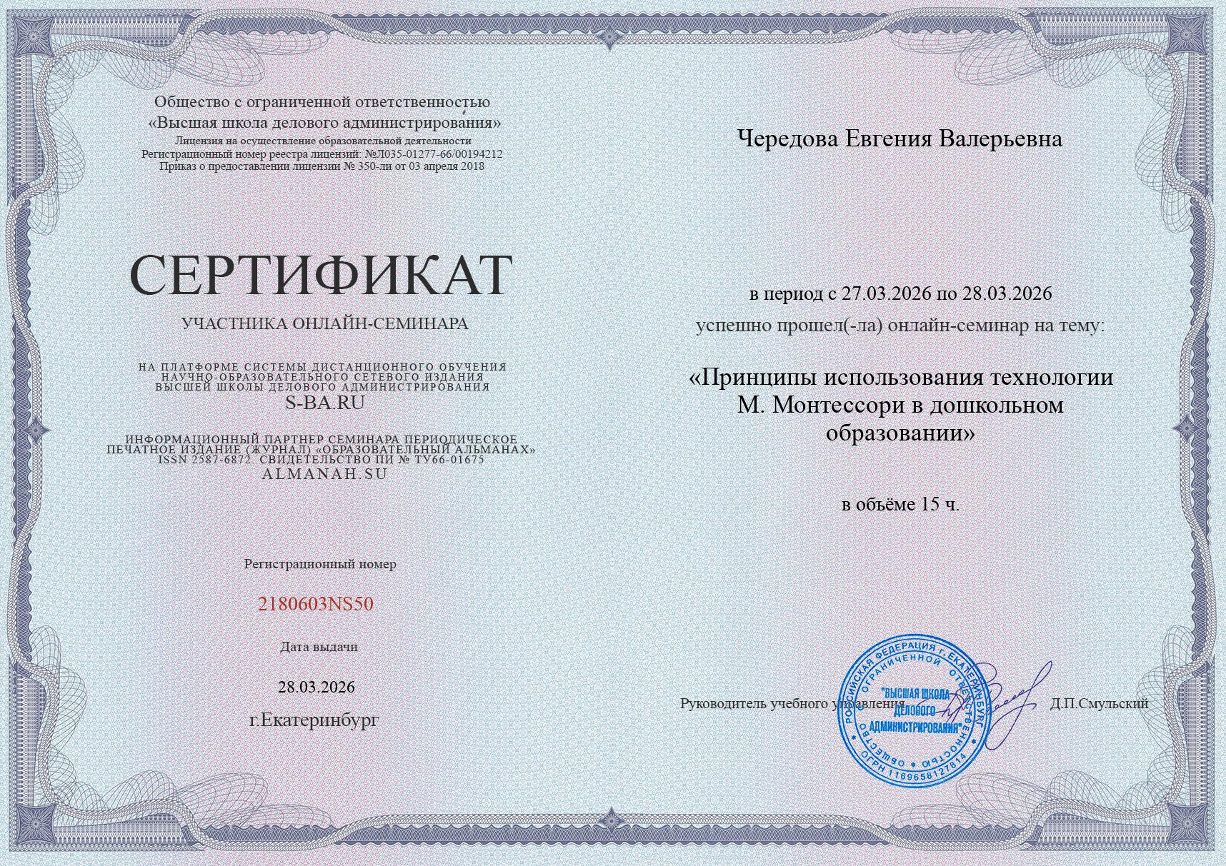 Сертификат участника онлайн-семинара "Принципы использования технологии М.Монтессори в дошкольном образовании" 28.03.2026