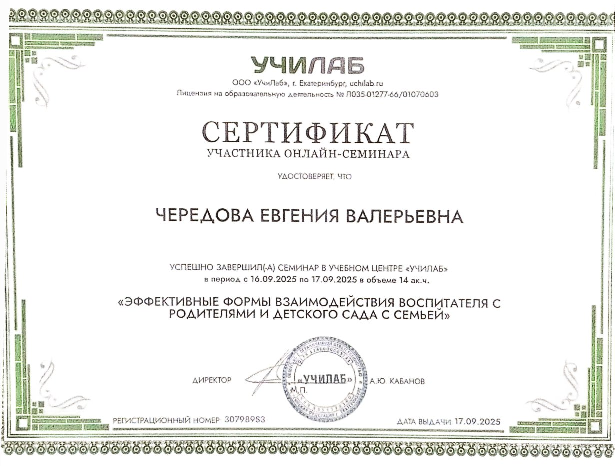 Сертификат участника онлайн-семинара "Эффективные формы взаимодействия воспитателя с родителями и детского сада с семьёй" 17.09.2025