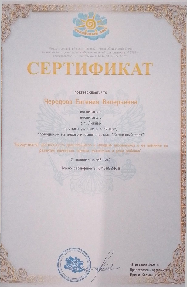 Сертификат за участие в вебинаре "Продуктивная деятельность дошкольников и младших школьников и ее влияние на развитие внимания, памяти, мышления и речи ребенка" 15.02.2025